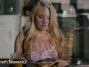Lena Paul indulges in a steamy dinner date that turns into wild cock riding and titty fucking with a hairy American stud.