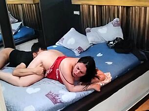 Amateur Thai ladyboy Cherry receives blowjob and assfucking in stockings POV