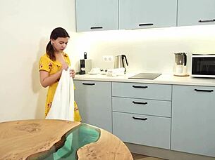 naughty housewife licks cum in kitchen, rides hard then squirts on face