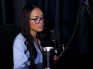 Nerdy busty brunette enjoys deepthroat blowjobs and cowgirl rides.