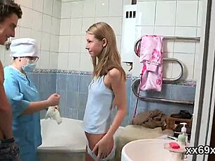 Helping virgin nympho hymen check then shaved pussy ride