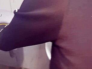 An amateur couple enjoys passionate moments in a public toilet.