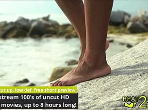 Beach bombshell Sexydea strips for erotic nude beach display.
