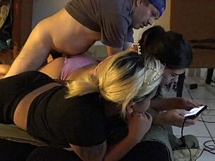Young redhead secretly sucks big cock while blonde is distracted by phone call