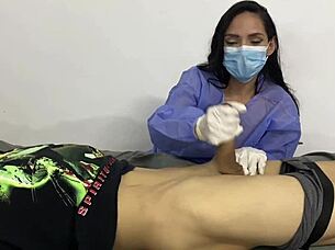 a nurse in medical gloves does handjob