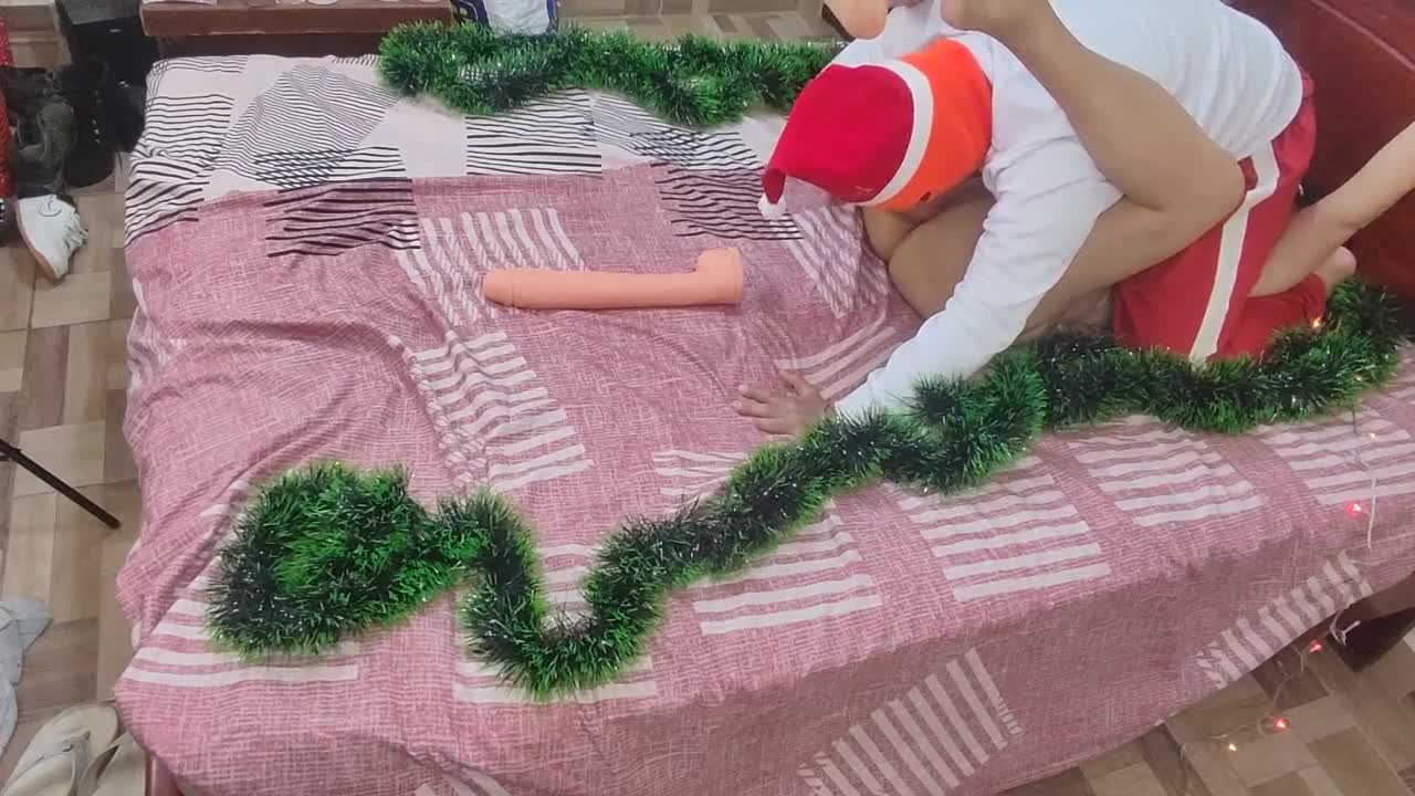 big dildo penetrates mature woman's hairy pussy during christmas festivities. she enjoys the solo play with toys.